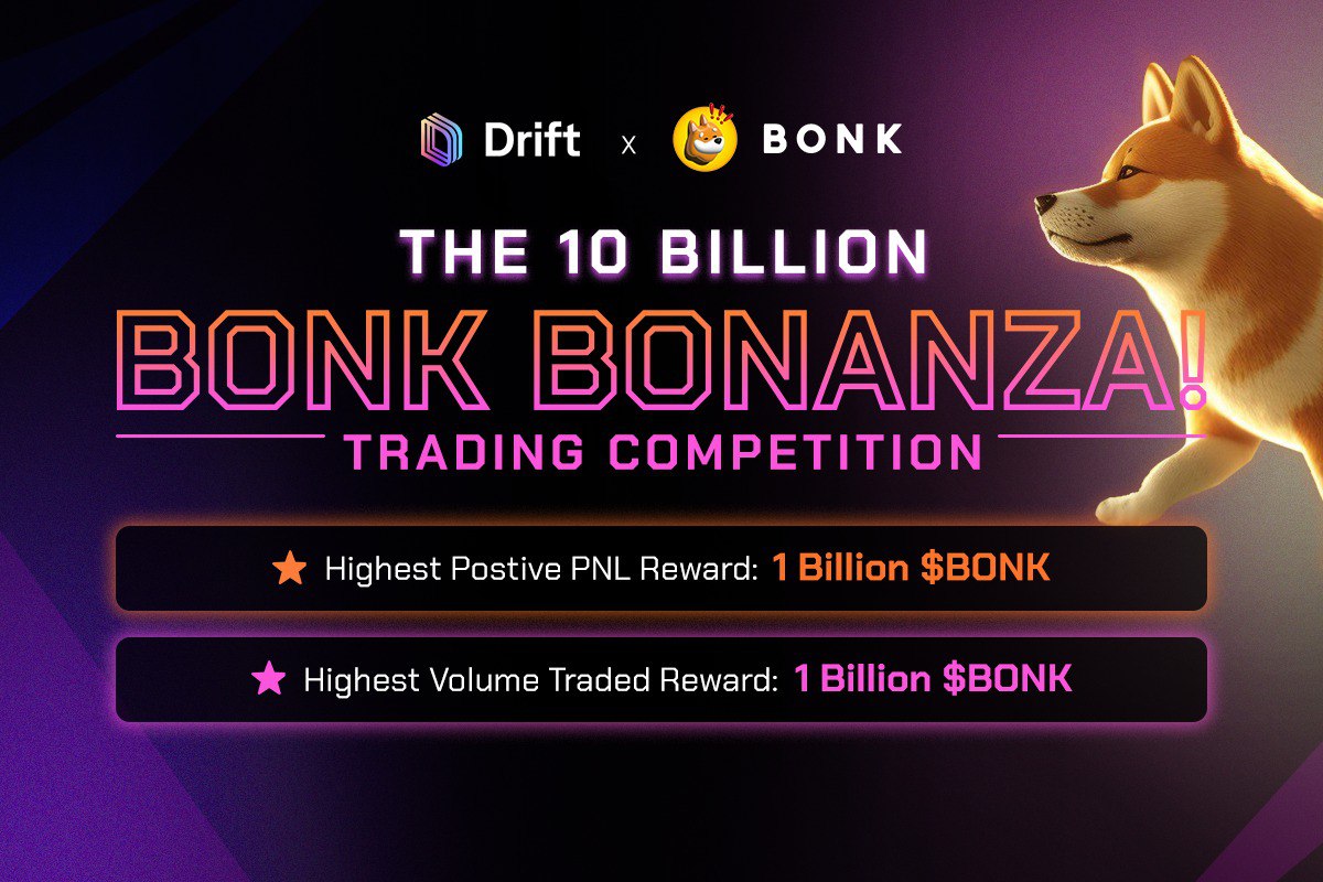 Between January 9th and January 14th, trade on Drift for an opportunity to take home a piece of the 10 Billion $BONK pool and ring in the new year with rewards! Unlock prize pools and join us for a trading competition where the top winners will take home with 1 Billion $BONK each 😮💰