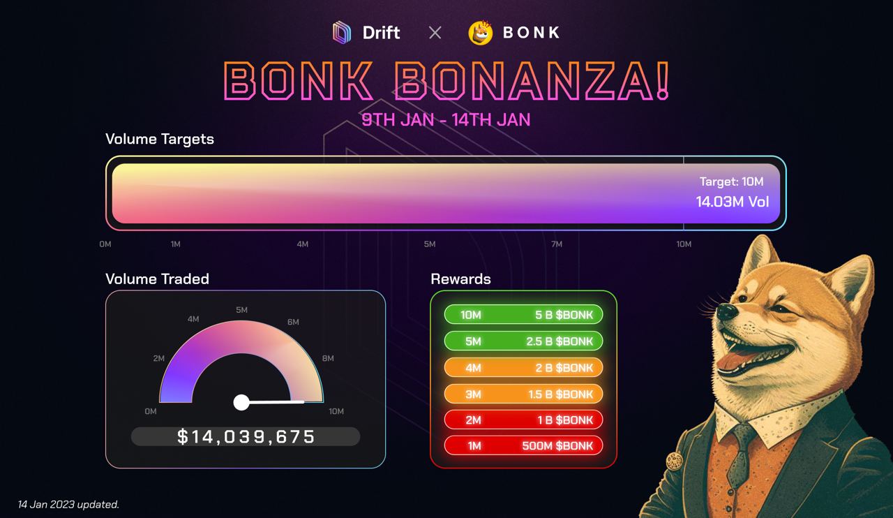 - Participants must enroll their wallet address in in Drift’s #competitions channel in Discord in order to qualify for the prize pool. To be eligible for any of the Bonk Bonanza challenges, traders only need to submit their wallet address once.
