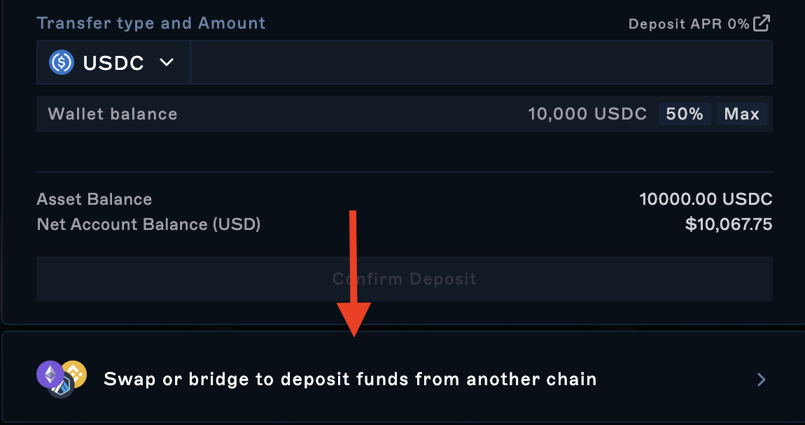 2) From this screen, navigate to “Swap or bridge to deposit funds from another chain” at the bottom. This will open up the interface to perform your first swap.
