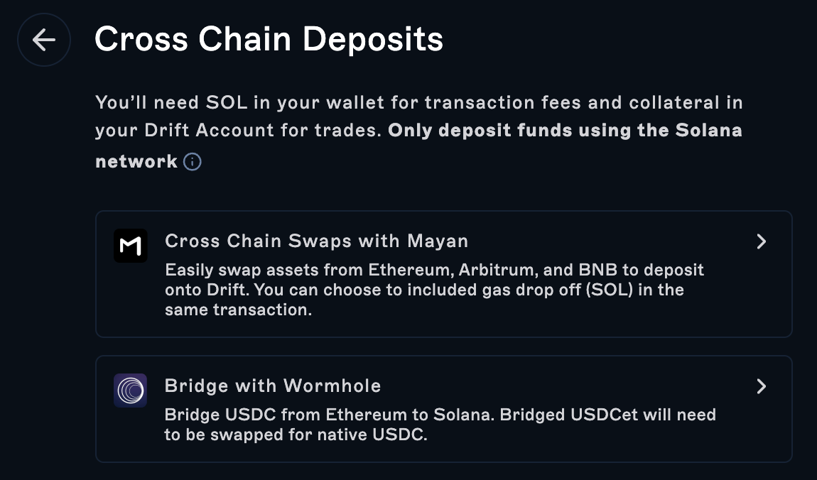 With the integration of Mayan Swap, traders can now perform cross-chain swaps from Ethereum, BSC, Polygon, Avalanche, and Arbitrum directly from Drift into native USDC or SOL on Solana. Wormhole bridge users will receive wrapped assets that they can then swap for USDC on Solana once the bridge is complete.