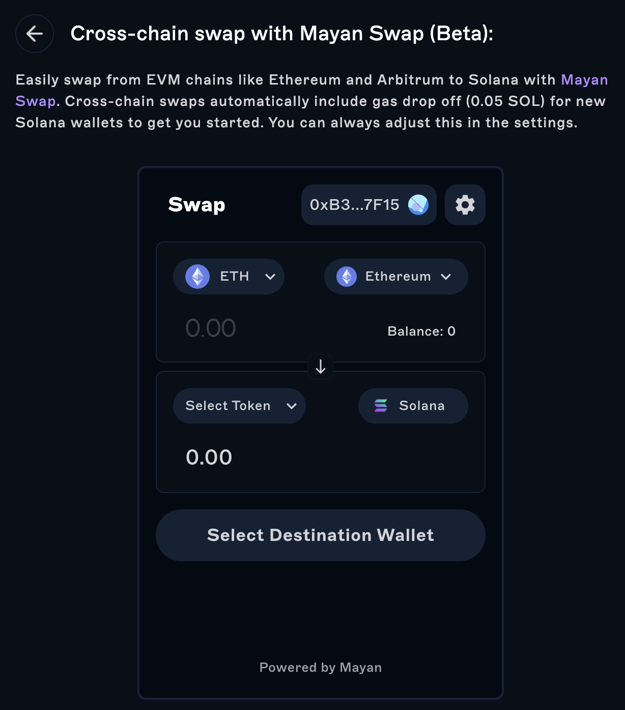 From here you’ll be able to directly swap from EVM chains such as Ethereum, BSC and Arbitrum into native USDC or SOL on Solana. Simply connect your wallet, select the chain and asset you’d like to swap to/for and select your destination wallet.