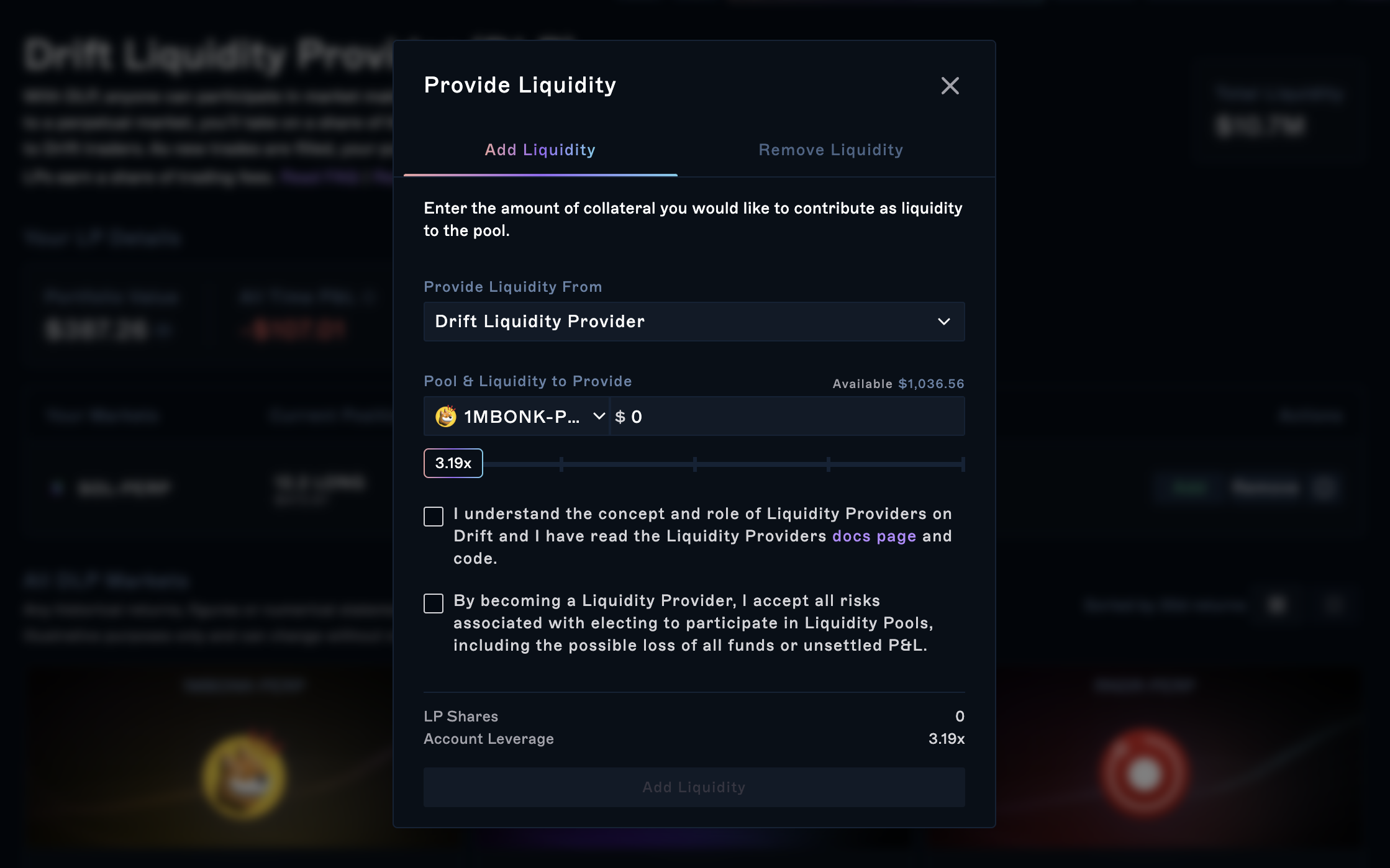 3. By clicking the "Add Liquidity" button, you'll be presented with a modal where you can input how much liquidity you want to provide to that perpetual market. When you add liquidity, a new subaccount called "Drift Liquidity Provider" will be created so you can track and manage your positions/P&L easily.