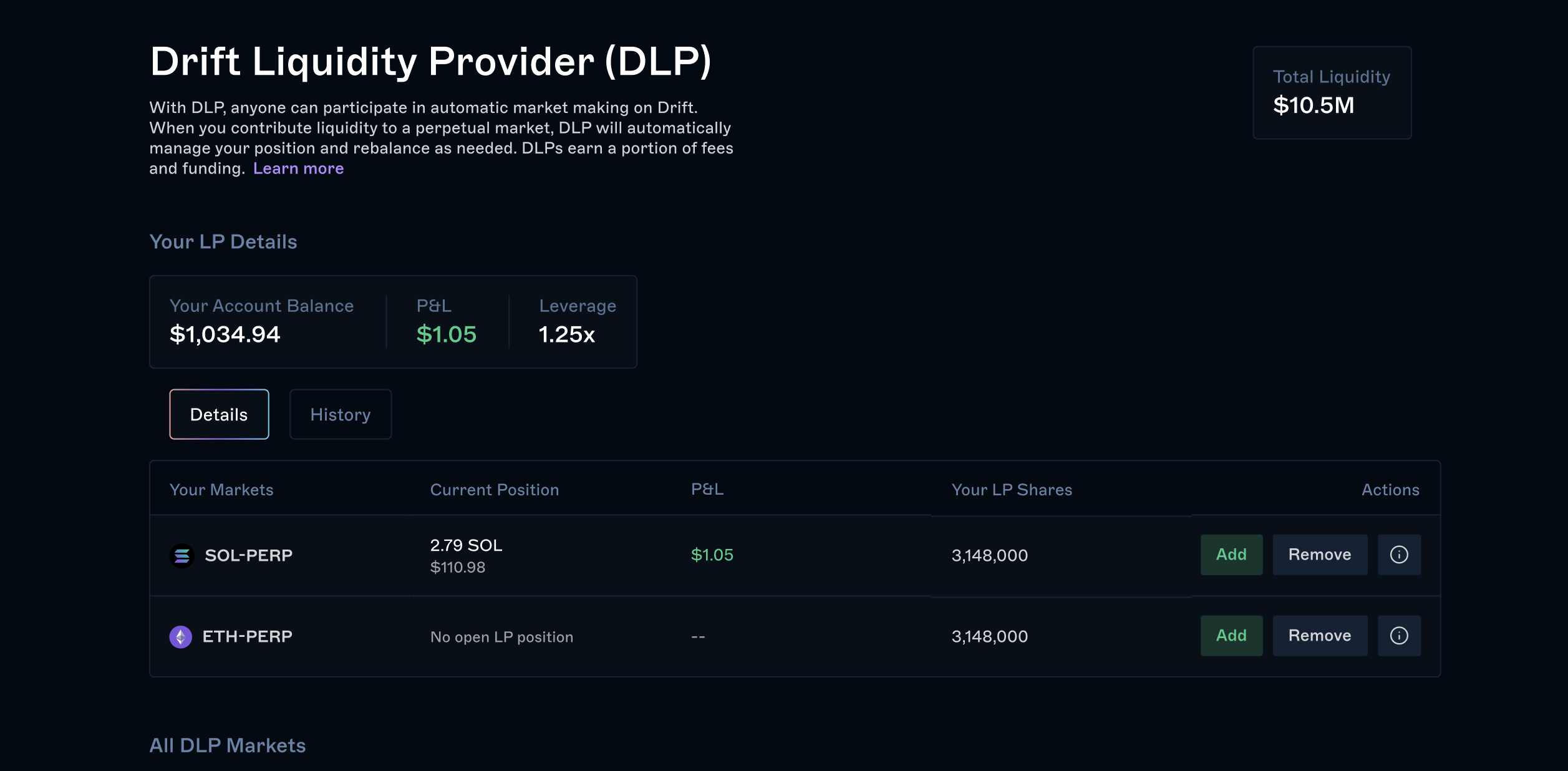 4. After you add liquidity, the page will update at the top to show the markets you've provided liquidity to and whether or not you have open LP positions. You can add and remove liquidity at any time, or close the position via the Trade page.