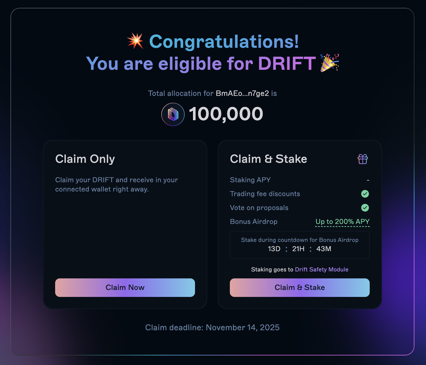 - Under 150,000 DRIFT: Claim by 14 November 2025 00:00 UTC+0