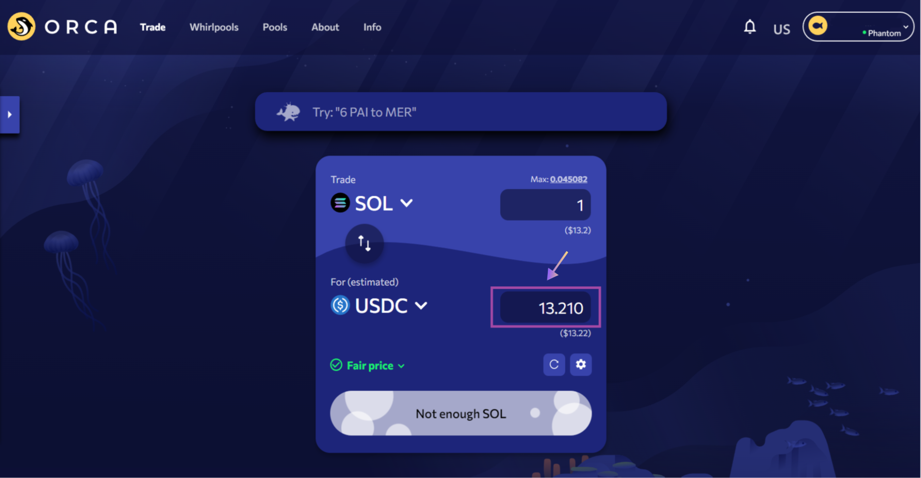 Click on the “Max” button for your SOL to select the entire amount you purchased. Start the process by clicking on the “Trade” button and confirm the transaction within your Solana wallet. After swapping, you’ve now successfully arbitraged SOL tokens between Binance and Orca for a profit of US$ 0.031/SOL minus fees.