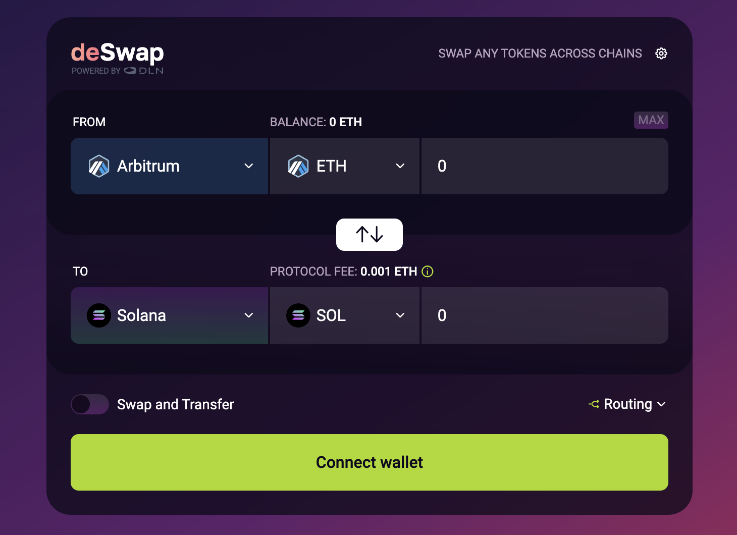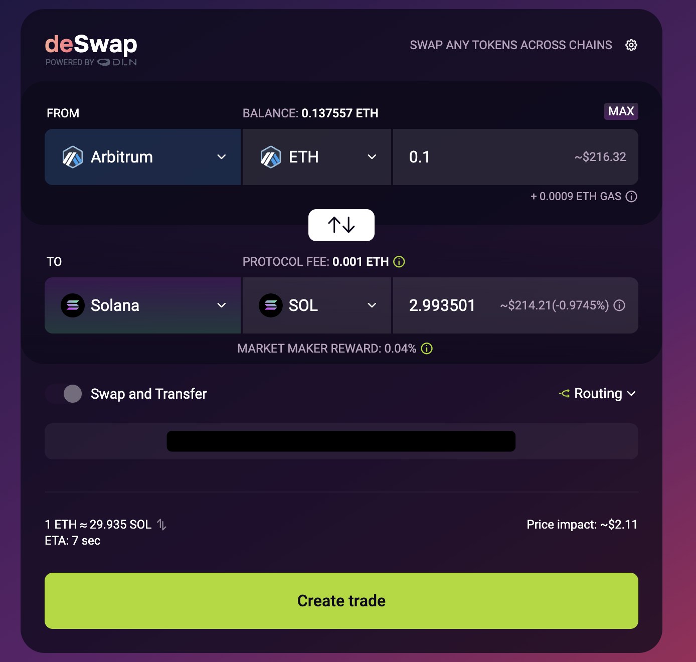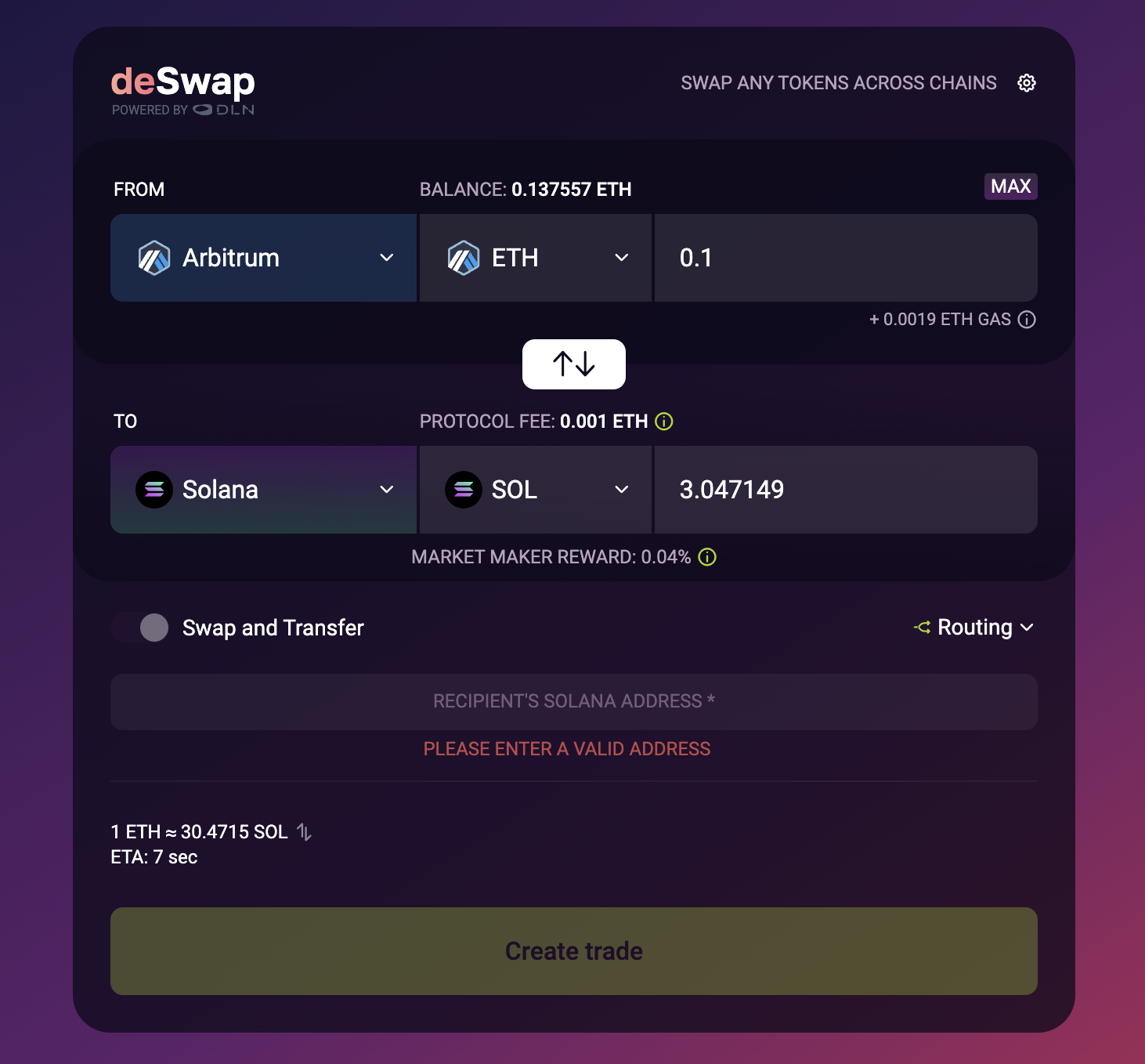 In this case, you're swapping ETH from Arbitrum to SOL on Solana:
