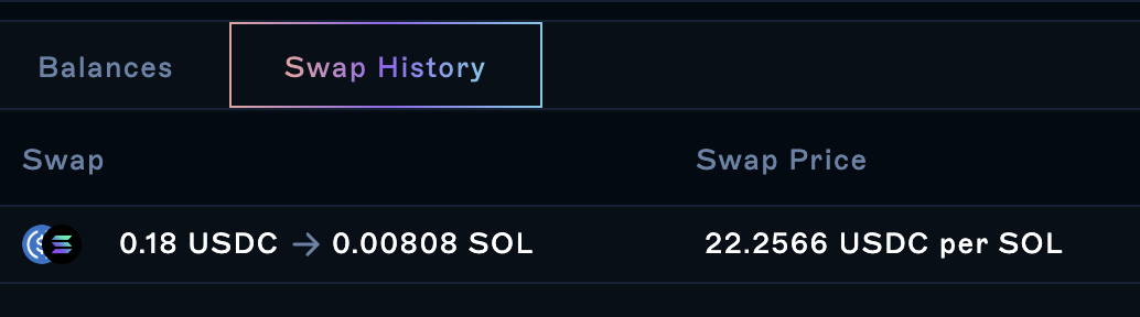 When you’re happy with your order, click the swap button to execute it. Below the graph, you should see your balances updated and you can check your swap history.