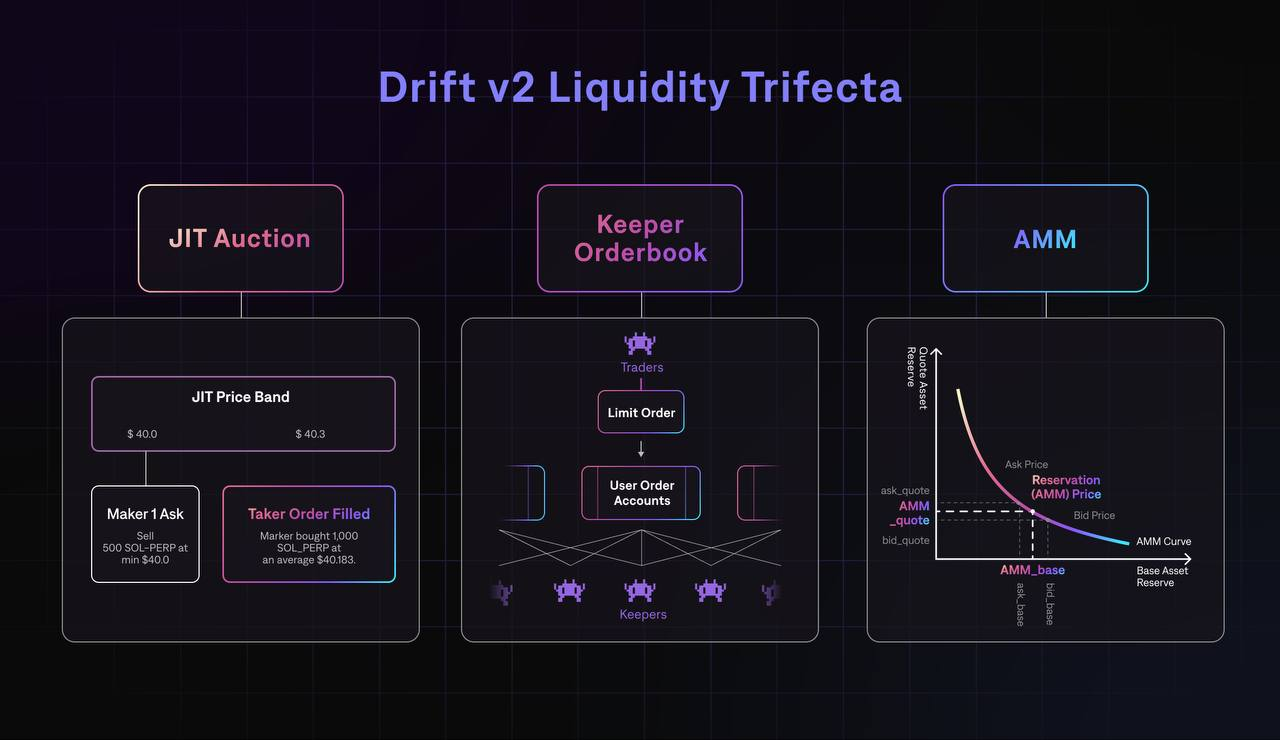 One of the key innovations of Drift V2 is the Liquidity Trifecta, a multi-faceted liquidity mechanism that combines Just-in-Time Auction Liquidity, AMM Liquidity, and Orderbook Liquidity. This allows us to overcome the on-chain limitations that many decentralised exchanges (DEXs) struggle with. For a comprehensive overview of the Liquidity Trifecta, read more here.