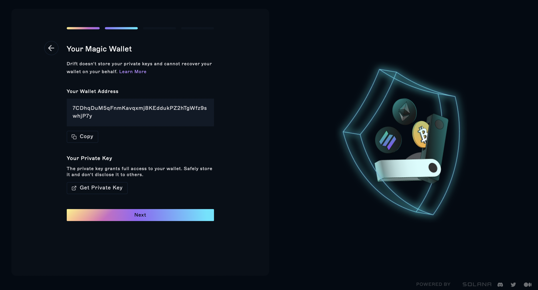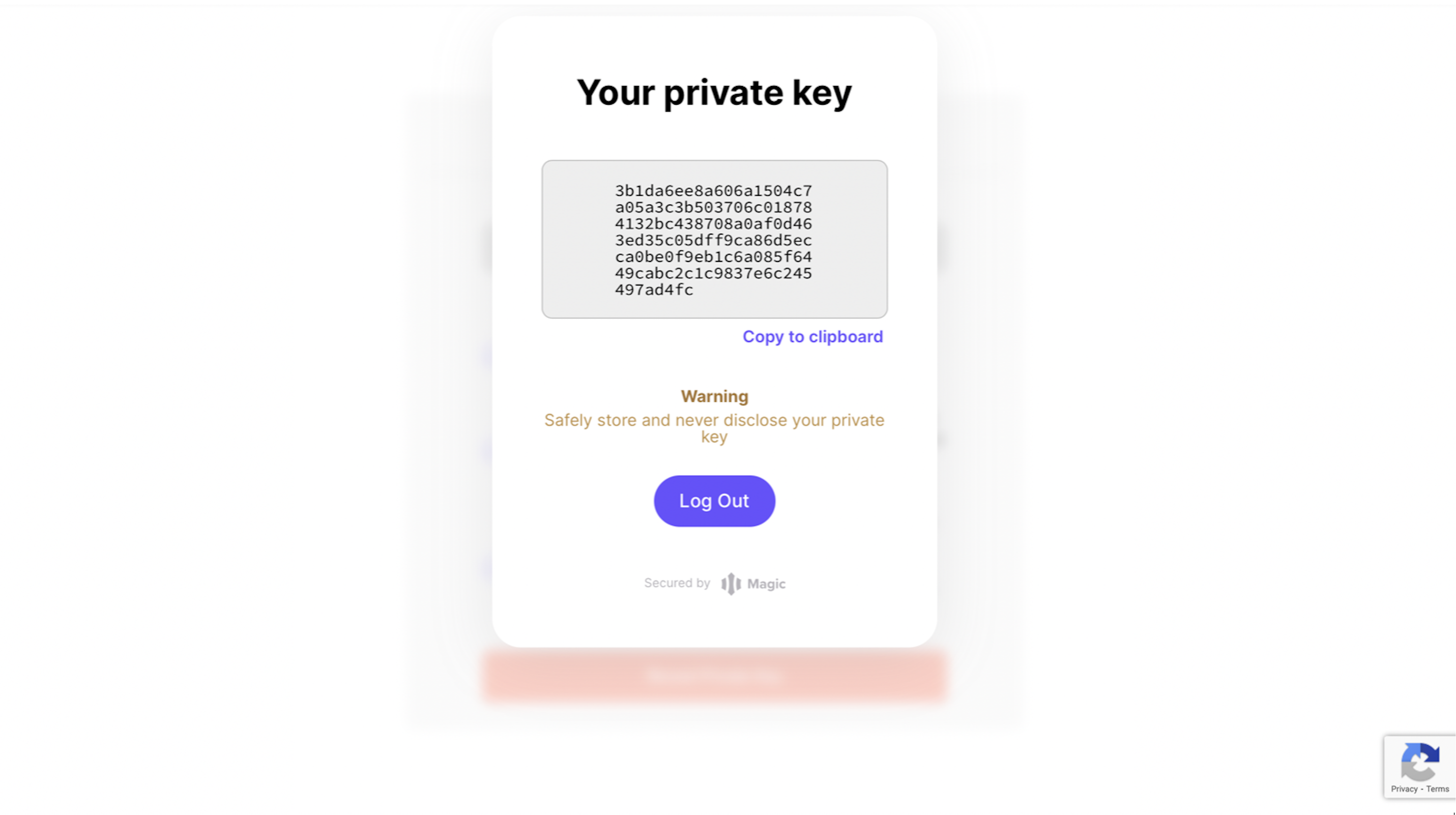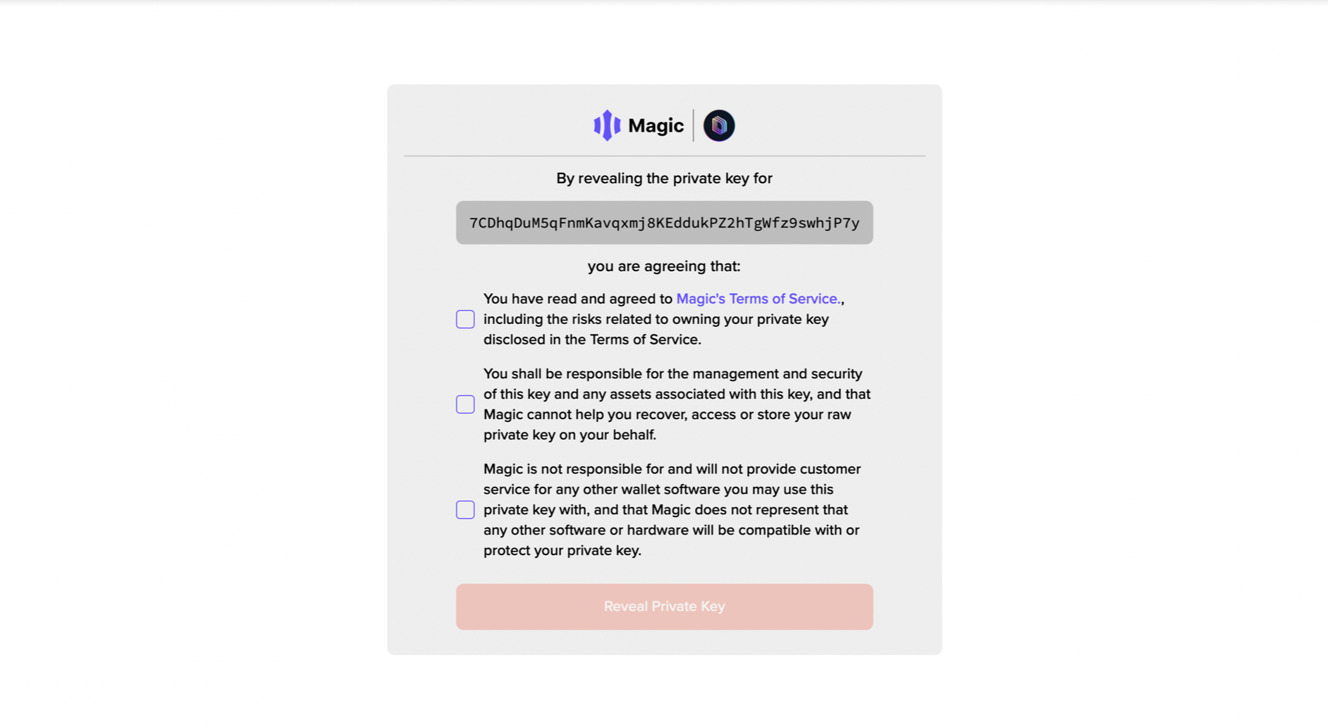Once you've verified, you’ll receive all your Magic Wallet details. This includes your wallet address and your private key. These can be retrieved at any time using email authentication.