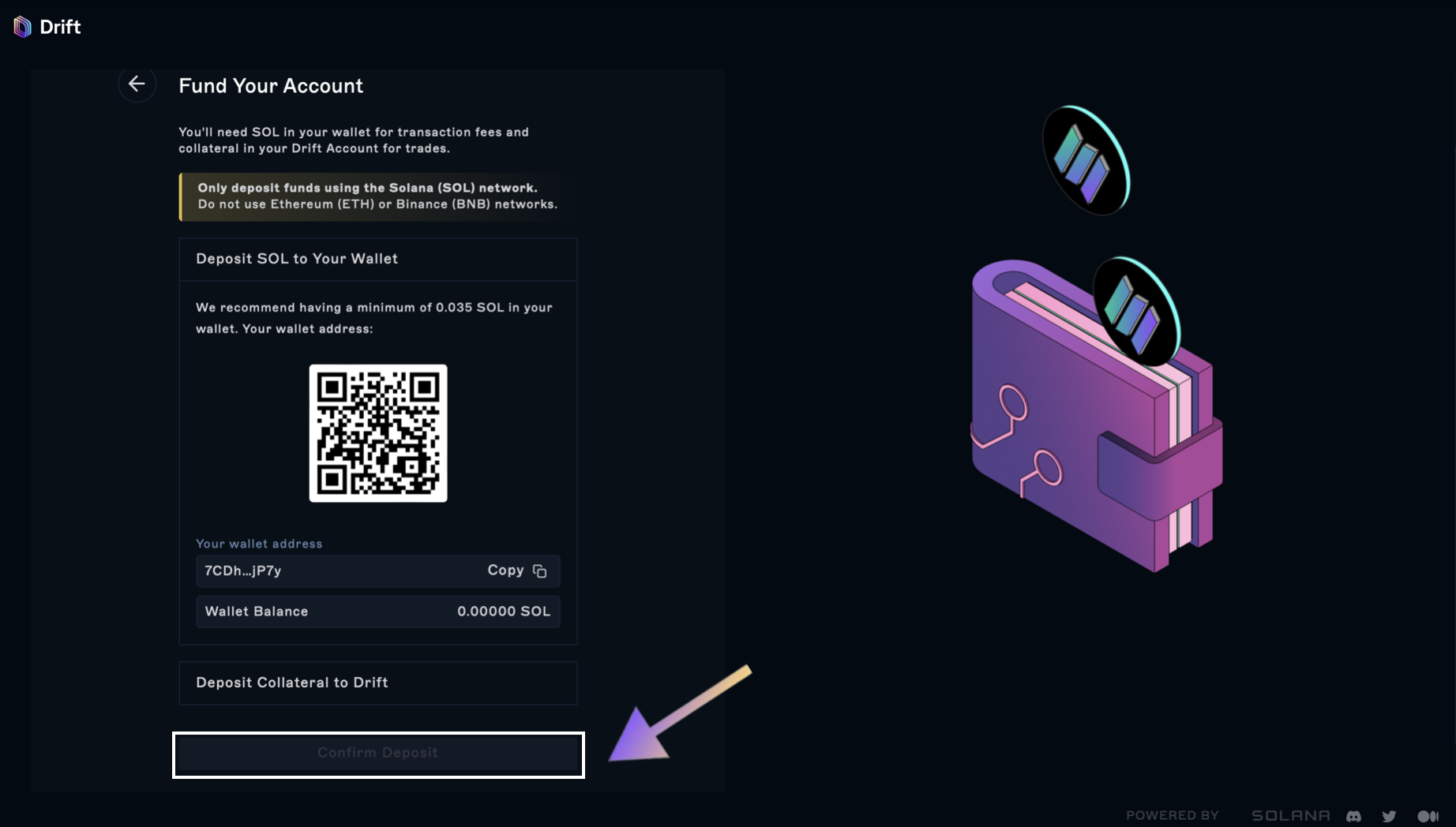 In the next step, you can fund your Drift account with either SOL or USDC.