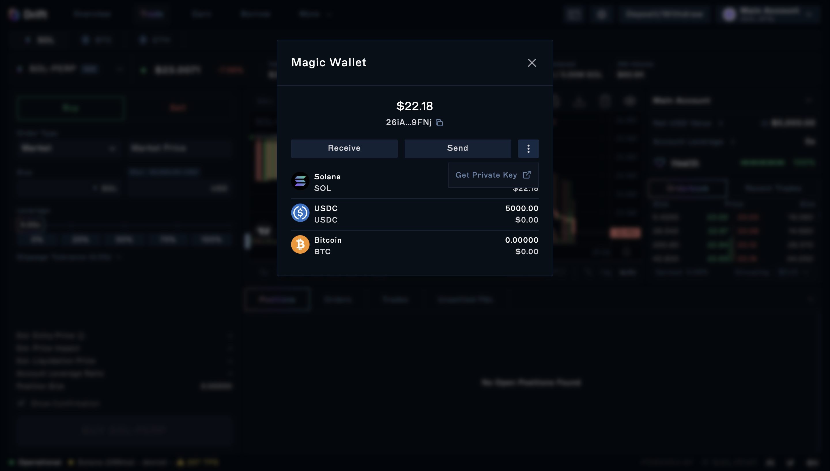 If you'd like to send and receive crypto currencies directly from and to your Magic Wallet, go to the Drift app, log into your account, click "Main Account" in the top-right corner, and select "Manage Magic Wallet". In addition to sending and receiving funds, you can also access your private key and see your token balances.