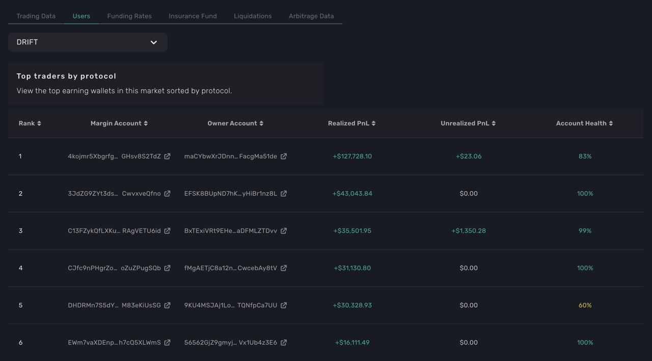 This website offers an unparalleled level of detail and insights into the activity on Drift, tracking information on user health, market makers, Drift's Decentralized Limit Order Book (DLOB), and much more. Whether you're an individual trader or a market analyst, this website provides the best option for tracking user activity and gaining valuable insights into the Drift trading ecosystem.